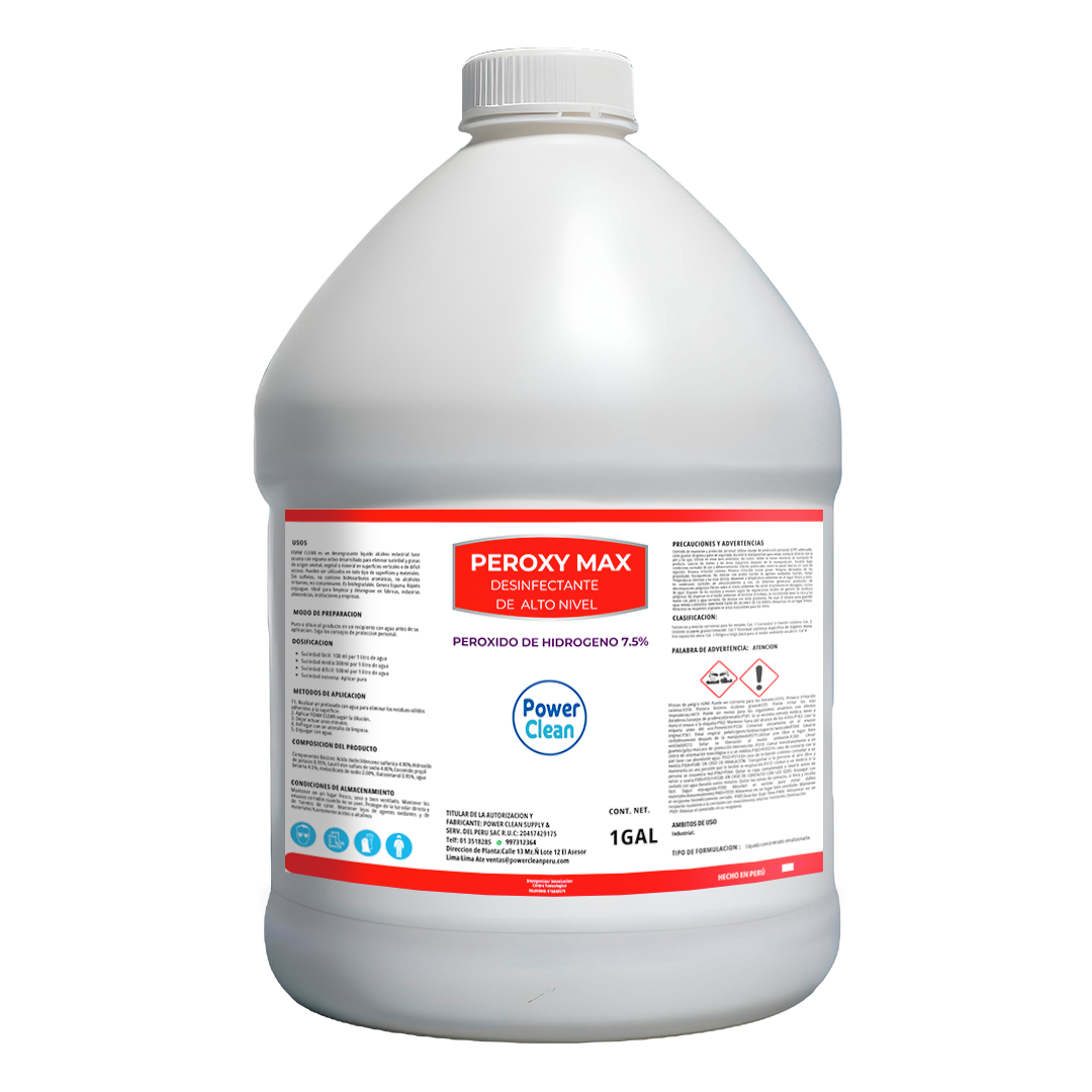 PEROXYMAX, es un desinfectante a base de peróxido de hidrogeno y ácidos orgánicos desarrollado para la eliminación de agentes patógenos (bacterias como Escherichia coli, Staphylococcus aureus, y hongos como Candida albicans). Ideal para la desinfección de todo tipo de superficies y equipos en industria alimenticia, agroindustria, procesadoras de alimentos y empaquetadoras, instituciones de salud, empresas, vivienda, etc. Aplicar en todo tipo de superficies y materiales como alimentos, plástico, acero inox, madera, aluminio, telares, alfombras, pétreos, cerámicos, etc. PEROXYMAX está reforzado con tensoactivos de última generación que le otorga propiedades limpiadoras, emulsionantes dispersantes y humectante. Neutralizador de olores y blanqueador. Es amigable con el medio ambiente.